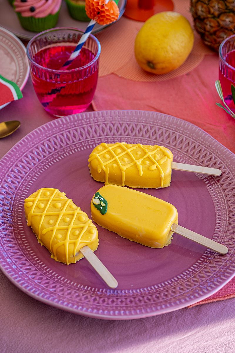 Разтопи останалия жълт шоколад отново, остави да се охлади леко, сложи го в еднократен пош и направи решетка върху кейксикълсите. Във всяка клетка направи точка (мотив ананас).