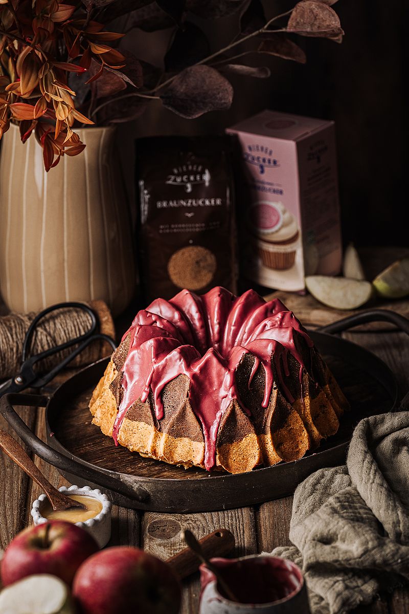 Смесете пресятата пудра захар лъжица по лъжица с червеното вино, за да се образува глазура – украсете гугелхупфа с глазурата.